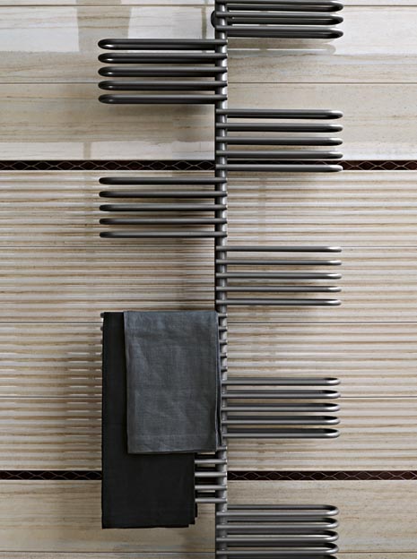 Le sèche serviettes KEY est composé d’éléments symétriques de 14mm monté en alternance autour d’un axe central.